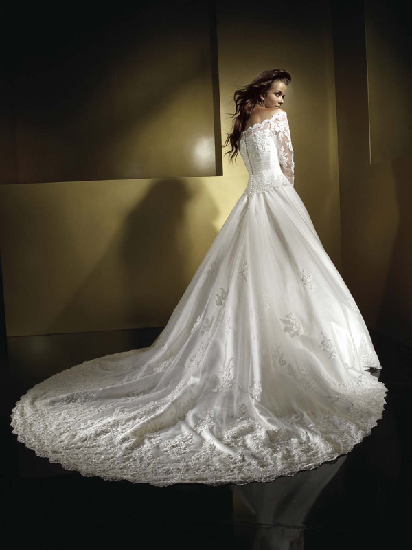 Satin gown.Tull overlay.Beaded Embroidery lace. Long sleeve. with Sweep train